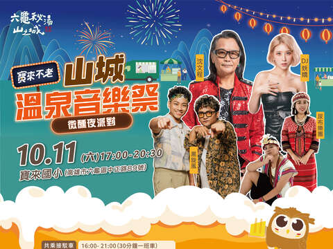 秋冬時節,誠摯邀請您前來高雄六龜,參與一年一度的音樂盛事—「寶來不老 山城溫泉音樂祭」。今年以「微醺夜派對」為主題,將在寶來國小的星空下,為您帶來一場結合音樂、溫泉與在地風情的難忘夜晚。