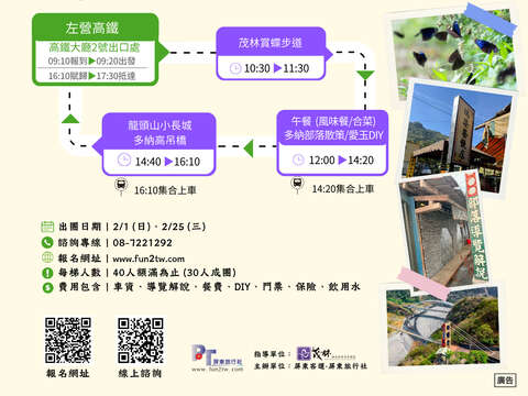 「2025-2026茂林賞蝶主題遊程專車」即日起全面開放報名,名額有限,歡迎民眾把握冬季限定時機,走進高雄市的後花園-茂林區、六龜區,近距離感受紫斑蝶飛舞的感動時刻還有暖心的療癒好湯,更多茂管處旅遊活動資訊,可至茂管處官網或追蹤茂管處 Facebook 粉絲專頁「Fun心遊茂林(茂林國家風景區)」獲得最新活動資訊!