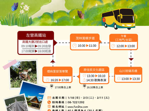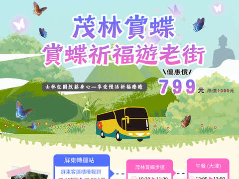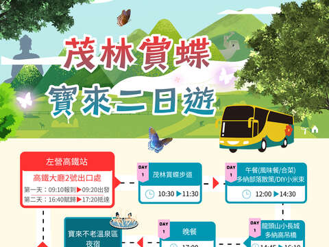 茂林國家風景區管理處指出,本次規劃以「安全旅遊、深度體驗、產業共好」為核心策略,結合專業導覽與宣導機制,讓遊客在安心旅遊的前提下,走進紫斑蝶越冬棲地,認識茂林區珍貴的自然生態與原鄉文化、六龜區的寶來不老溫泉好湯,遊程內容結合賞蝶導覽、部落體驗、在地美食與手作活動,更是加入溫泉泡湯行程,提升遊程內容深度,延長遊客停留時間。本次主題遊程共規劃多條路線,包含一日遊與二日遊行程,行程內容涵蓋茂林賞蝶步道、多納部落散策、原住民文化園區、旗山老街、十八羅漢山遊憩區及寶來不老溫泉區等知名景點,並搭配專業導覽解說,讓遊客更全面了解紫斑蝶生態及茂林地區的自然與人文特色。