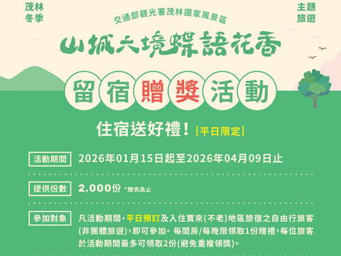為振興高雄山城地區冬季觀光,交通部觀光署茂林國家風景區管理處攜手在地旅宿與觀光產業,共同推出「2025-2026冬季主題旅遊推廣活動」,以「留宿贈獎」、「留宿抽獎」、「特約商家消費集章贈禮」三重好康,鼓勵遊客於平日到茂林、六龜(寶來/不老溫泉區)及周邊山城聚落,體驗溫泉療癒、自然生態與部落文化,帶動區域觀光消費動能。