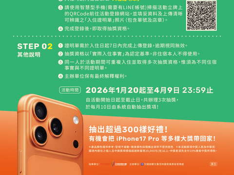 此外,本次同步推出「留宿抽獎活動」,遊客於平日入住合作旅宿時,由櫃檯開立「入住證明單」,即可透過手機上網登錄個人資料並上傳證明照片,經系統審核後即可獲得一組抽獎序號。自活動辦理期間每月將抽出100份獎品,共計300份,總獎項金額高達50萬元,讓遊客住得開心、抽得驚喜。