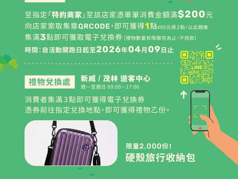 活動期間,遊客至指定特約店家單筆消費滿新臺幣200元即可獲得1點,消費滿400元可獲得2點,以此類推;當集滿3點後,即可持電子集章紀錄,前往新威遊客中心或茂林遊客中心,免費兌換「活動限定收納包」乙份,總數量限量2,000份,送完為止。