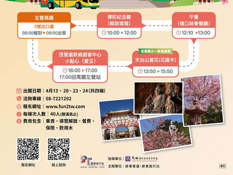 茂管處柯建興處長表示,本次推出「賞花祈福之旅」遊程,除了推廣六龜在地人文宗教特色以及結合在地產業,也歡迎順遊東高雄的美景一同進入六龜山城泡湯、賞花,體驗最 chill 的山城魅力。本次賞花祈福專車行程安排4梯次(4/13、20、23、24)每人599元,預計115年3月30日上午10點