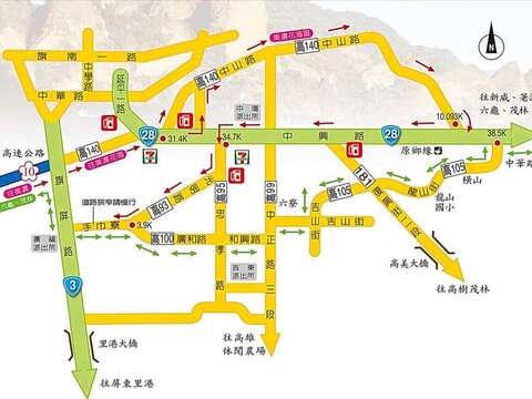 台3線(里港河濱公園)→台22線(高樹)→台27線→高132線(茂林牌樓廣場、布魯布沙吊橋) →高132線(龍頭山小長城步道、多納古戰場、紅塵峽谷)。