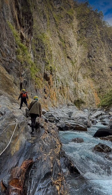 可穿著包覆腳趾的溯溪鞋與防滑鞋,衣褲選擇柔軟耐磨擦的材質,避免穿著牛仔褲等吸水後沉重的衣物。